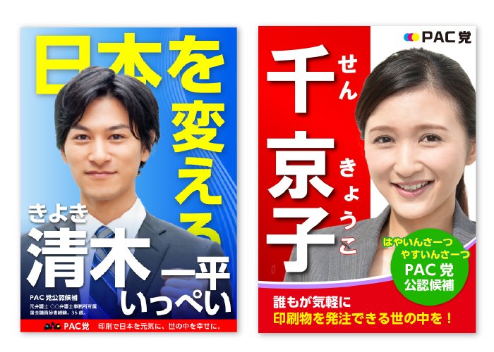選挙ポスター、選挙リーフ(証紙ビラ)、選挙はがき、後援会リーフ、名刺…
